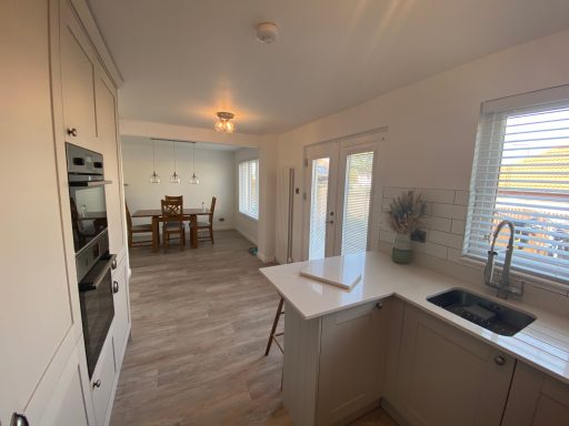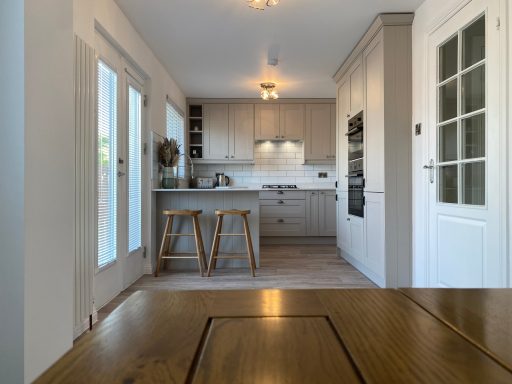 This beautiful kitchen transformation showcases a seamless blend of elegance and functionality. A full electrical rewire and the removal of a load-bearing wall have opened the space into a stunning kitchen/diner, flooded with natural light and amazing lighting. The designer radiator adds a touch of modern sophistication, while the luxurious LVT flooring complements the soft-toned cabinetry and sleek quartz countertops. Every detail, from the integrated appliances to the ambient lighting, creates a warm, inviting atmosphere perfect for both entertaining and everyday living.