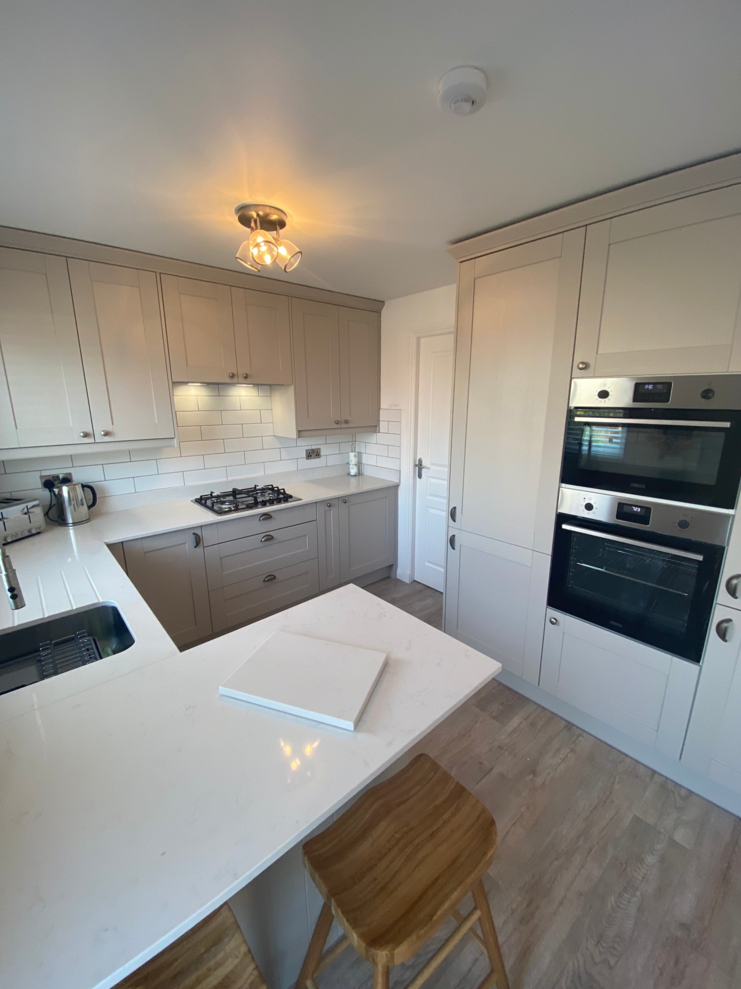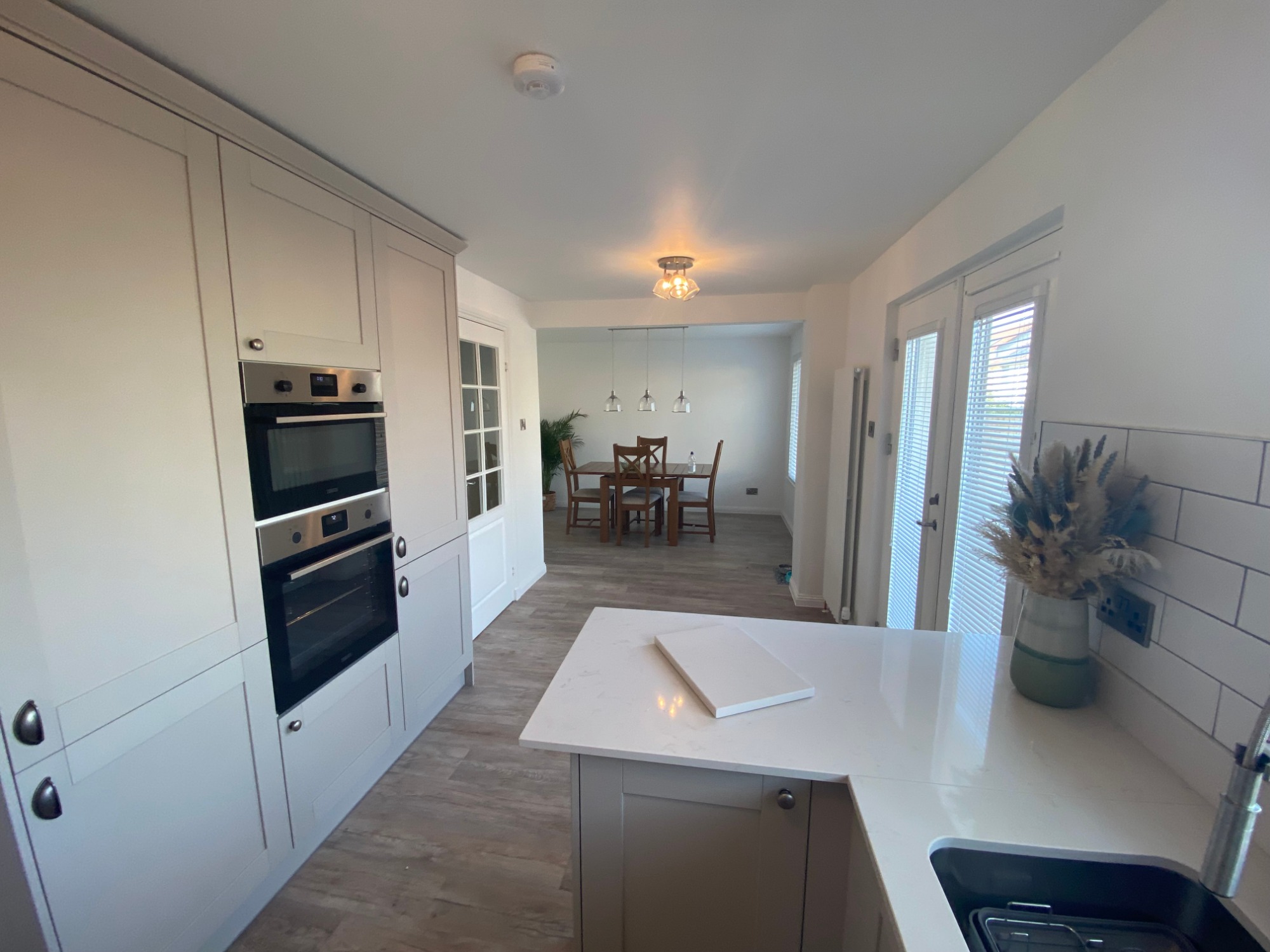 This beautiful kitchen transformation showcases a seamless blend of elegance and functionality. A full electrical rewire and the removal of a load-bearing wall have opened the space into a stunning kitchen/diner, flooded with natural light and amazing lighting. The designer radiator adds a touch of modern sophistication, while the luxurious LVT flooring complements the soft-toned cabinetry and sleek quartz countertops. Every detail, from the integrated appliances to the ambient lighting, creates a warm, inviting atmosphere perfect for both entertaining and everyday living.